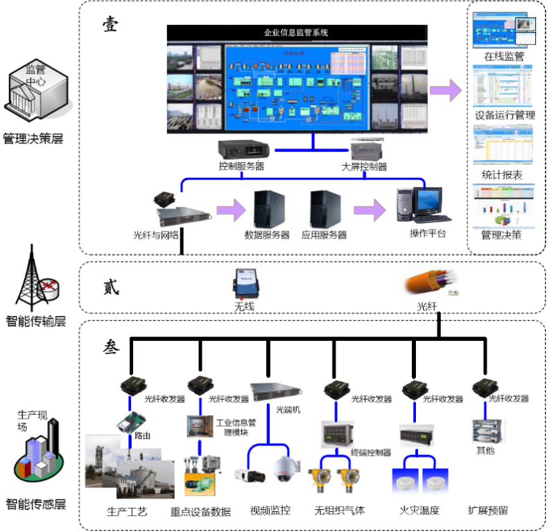 雨水排放綜合監(jiān)控系統(tǒng)是通過在企業(yè)現(xiàn)場端建設(shè)雨水排放監(jiān)測子系統(tǒng)以及雨水排放監(jiān)控子系統(tǒng),通過傳輸層,將數(shù)據(jù)傳輸?shù)街行钠脚_(tái)端,建設(shè)雨水排放綜合監(jiān)控平臺(tái),利用平臺(tái)軟件的實(shí)時(shí)監(jiān)控、異常報(bào)警、遠(yuǎn)程控制、數(shù)據(jù)管理、報(bào)表管理、應(yīng)急預(yù)案、信息管理、系統(tǒng)管理功能,實(shí)現(xiàn)有效監(jiān)控雨水管網(wǎng)水質(zhì)、識(shí)別是否有污水混入雨水管道的現(xiàn)象存在、實(shí)時(shí)監(jiān)控雨水收集池水質(zhì)水量、雨污有效分離等業(yè)務(wù)功能,為園區(qū)雨水和污水的排放監(jiān)管提供有力的技術(shù)支撐。