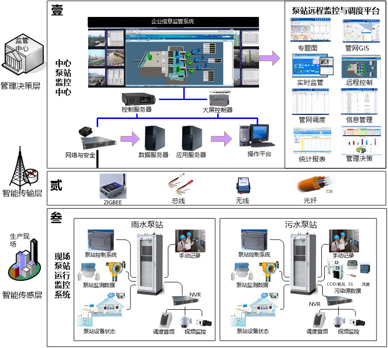 管網(wǎng)泵站遠(yuǎn)程監(jiān)控與調(diào)度系統(tǒng)是通過在現(xiàn)場雨水與污水泵站建立自動(dòng)控制、設(shè)備狀態(tài)監(jiān)控、視頻監(jiān)控、調(diào)度音頻等方面的綜合運(yùn)行監(jiān)控系統(tǒng),并與中心運(yùn)行與調(diào)度平臺(tái)實(shí)時(shí)對接,實(shí)現(xiàn)泵站運(yùn)行監(jiān)控、遠(yuǎn)程控制、綜合調(diào)度的等功能,為提高管網(wǎng)泵站運(yùn)營管理效率,降低運(yùn)行成本提供確實(shí)可行的科學(xué)手段。